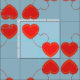 Graphic image of one "wire-heart" flanked by two "solid" hearts on a 45 degree angle. This motif if replicated in the "mirrored" tile, forming squares outlined in hearts. Light blue background may be customised.