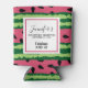 Birthday can cooler with a cute watermelon pattern. Green rind in layers of stripes along with a layer of pink stripes with black seeds inside.