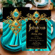 Fabulous Elegant Birthday Teal Blue Silk Gold Gems Invitation