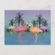 Graphic watercolor painting of sky, water, and greenery backround and illustration of flamingos and trees. Flamingo ballerinas are dancing on the water and appear to be floating.