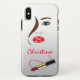 © Sunny Mars Designs. Face & Lipstick Custom Case-Mate iPhone Cases – Trendy chic girly hair and beauty makeup cosmetics stylish modern feminine cases with woman's face, full lips, blue eyes, brown hair and name in lipstick. Personalise it by adding your own name or other text to it. Perfect gift for makeup artists, beauticians or cosmetologists.
