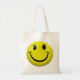 A Zazzle Top 10 Tote Bags Award Winner! Big shiny happy face button pin (realistically printed, not a real pin) in original, traditional yellow with bold black features on a stylish tote bag. Carry a happy face along with you. You're sure to get smiles everywhere you go! A great gift idea! Don't worry, be happy!