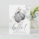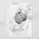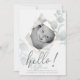 Birth Announcement | OnTrend diamond shape faceted photo frame for your baby's photo, in Alabaster White surrounded by watercolor eucalyptus leaves - ' hello! ' in hand written calligraphy with minimal baby details and name at bottom. Trendy Stylish and Modern.