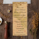 A very decorative, boho wedding program with a gold and peony pattern, it has an elegant, shabby chic look with its faded floral pattern in harvest gold and ornamental, gold floral pattern in (faux) gold metal at the top.