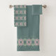 Designer bath decor, towel set in shades of muted teal and faded pink. The background colour can be changed to any colour, pattern is removable if you prefer.