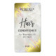 Hair care products such as shampoo, conditioner and treatment labels with fading gold foil and opal glitter on a marble background.
