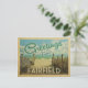This Greetings From Fairfield vintage postcard design features a sandy beach with a beautiful turquoise ocean water and above the sea, a blue sky with billowy white clouds. In vintage travels style.