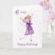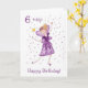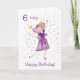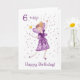 A pretty birthday card for a 6 year old with a fairy, dressed in purple, scattering fairy dust, from a watercolour painting by Judy Adamson. Blank inside for your own message.