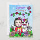 Pretty whimsical fairy tale style black haired Caucasian or Asian girl fairy Birthday invitations with folk art style hand sketched fairies, flowers and butterflies. Purple, pink, red, lime green and all kinds of pretty bright colours!