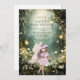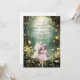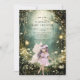 A magical fairy themed enchanted forest baby shower invitation, featuring an enchanted forest setting in the woods with glowing hanging lights, and a fairy on a wooded path. Available in print, as a digital download to send on your phone, or both.