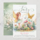 An enchanting watercolor illustration featuring a sweet little fairy in a small enchanted garden with an emerald green and gold colour scheme, decorates this elegant and adorable baby girl shower invitation. Perfect for a springtime celebration, Easter events, a summer garden fête, or a charming picnic-themed baby shower, or for a year-round celebration in honour of a mum who loves the enchanted forest, fairy theme.