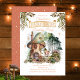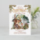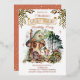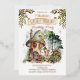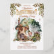 A sweet little woodland fairy stands outside of her mushroom house among the mushrooms, the forest and the woodland forest animals as greenery boughs drape gracefully on either side of her in this "Fairy First" girl's 1st Birthday Party composite design by Holiday Hearts Designs.