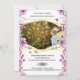 A beautiful and magical large tree with branches stretching outwards is surrounded by small magic fireflies and string lights. The tree is in a forest and has lush green foliage around it and pretty butterflies flying through the air. The forest scene is framed by a hexagonal faux gold geometric frame that has a pretty brunette fae or faery girl with pale yellow wings, wearing a blue summer dress, standing on the edge of the frame looking into the woodland. Pretty peony flowers form a border edge to this invitation. This is ideal for little girls mythical birthday parties; for adorable baby shower events and fairytale theme birthdays.