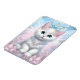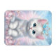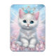 An adorable fairy princess white kitten with jewels, pink flowers and fairy wings on a sparkly blue background.