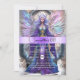 A beautiul fairy princess has her iridescent fairy wings open wide and is standing against a magical portal door. She is wearing a long blue and purple robe edged with faux gold and a bustier. Her long silver white hair cascades down around her shoulders. Her hands are stretched out and the palms of her hands are facing up. White text templates appear below her for your custom wording and a faux shiny purple band has black templates. The back has the same graphic with an extra text template for additional wording or information that you may want to convey to your guests (directions, accommodation etc). Should it not be required, simply delete the wording to leave it blank. This waterolor comic graphic is ideal for a witch party; a Halloween theme celebration; a girls fairy fairytale or a magic themed birthday.