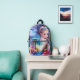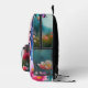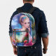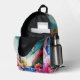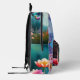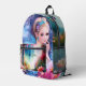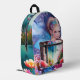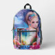 Watercolor fairy princess. This backpack has lots of flowers, butterflies and a blue fairy princess. Front pocket has a castle garden with pillars and lots of flowers.