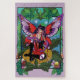 A black haired fairy all in purples and red sitting on a mushroom and a green man borders the fairy