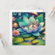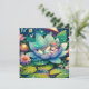 Cute little fairy sleeping on a lotus flower on a lily pad with flowers and mushroom background. Cute fairytale style illustration. Blank card.
