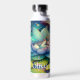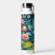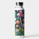 Personalised fairy water bottle. Cute little fairy sleeping on a lotus flower on a lily pad with flowers and mushroom background. Cute fairytale style illustration.
