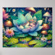 Cute little fairy sleeping on a lotus flower on a lily pad with flowers and mushroom background. Cute fairytale style illustration.