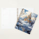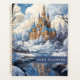 This planner features a winter illustration of a fairy tale castle with elegant blue turrets inspired by German and French design. The castle is surrounded by snow-capped trees and a small creek flows in front of it. The design is the same on the front and back covers. Personalise the front with the current year.