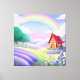 This digital artwork depicts a fairy-tale world filled with innocence and magic. The scene is brightly lit by a vast, soft-coloured Rainbow, arching over hills blanketed with romantic Purple Lavender. A cosy little cottage with a vibrant red roof sits nestled in the hills, with a stone path winding towards it, creating a warm and peaceful atmosphere.