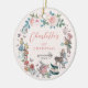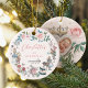 Vintage Alice in Wonderland fairytale baby girl's first Christmas ornament. The design features an elegant frame design with Alice in Wonderland characters, the mad hatter, Alice, the white rabbit, florals, butterflies, and fairytale tea party elements framing around the ornament. Personalise with the baby's name, your text, and year. The ornament's reverse side displays a photo placeholder within our heart crown and floral photo frame design to display your baby's photo beautifully. Designed by Moodthology.