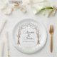 These elegant and romantic custom wedding plates feature a watercolor fairy tale style archway of tree branches. The limbs, branches, and leaves of the trees are crossing over to create a beautiful entrance to a whimsical forest. The arch wraps around the names of the married or engaged couple. It's perfect for a Boho style, fairytale inspired, or romantic wedding theme. The names are printed in an elegant script font which you can personalise to include your own names or other custom text.