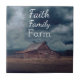 This product features a painting of a log cabin set in a rural countryside setting with the text "Faith Family Farm".