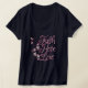 Hot pink and grey faith, hope, love design with butterflies and stars. The text is a curly font. A girly inspirational design for women and girls. Featuring the virtues of faith, hope, and love. Change the navy blue t-shirt to any other colour or style you like.