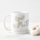Decorated hand drawn letter with your own name beginning with F and name meaning mug. Pretty heart and flower capital F doodled typographic design featuring hearts and flowers and the words Faith A faithful, kind beauty and trusted friend in grey, pink, purple and yellow. © Unique art and design by Sarah Trett. www.sarahtrett.com for www.mylittleeden.com on zazzle