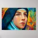 This vibrant poster of Saint Teresa Benedicta of the Cross (Edith Stein) captures her quiet strength and courage. With bold colours and thoughtful expression, it inspires trust in God’s plan, even in suffering. A meaningful addition to any prayer space, classroom, or home, it encourages reflection on faith and perseverance.