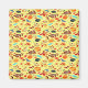 Fall pattern with pumpkins, dry leaves, nuts and mushroom on yellow background.