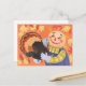 A colourful turkey bird, and a friendly scarecrow visit on a fall day. Lemon yellow and burnt sienna leaves frame the scene. Original illustration by Noël Snow.