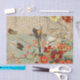 Left hand side for doors. 1 of 2 coordinating images. This is a vertical design layout that has a matching design when used together will create two large sized facing doors or one large surface. The design is placed over a rustic pale blue grey crackle painted weathered background that also has calligraphy and script handwriting ephemera. A mix of vintage botanical florals, mushroom, feathers and a botanical bird which were graphically designed into a collage by internationally licensed artist and designer, Audrey Jeanne Roberts, copyright.
