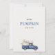 Boy's autumn foliage pumpkin truck baby shower invitation featuring a dark blue truck, white pumpkin and a hint of blue and autumn colors floral arrangements. This fall themed pumpkin truck boy's baby shower invitation is ideal for a boy's fall baby shower.