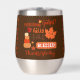 Add an autumnal touch to your beverage experience with this stemless wine tumbler featuring a festive pumpkin design. The brown background and intricate fall pumpkin details enhance the cosy ambiance of your Thanksgiving and autumn celebrations. Crafted for durability, this tumbler keeps your drinks at the perfect temperature, offering both style and practicality. Whether you're celebrating with friends or enjoying a quiet evening, it’s a charming way to enjoy the season.