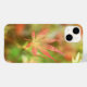 Against the backdrop of green summer leaves of a Japanese maple flushing to autumn reds and yellows, a rose and gold skeleton leaf drifts slowly down to the ground.