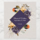 Fall themed stylish wedding wine bottle label done in an ivory faux corrugated like texture. A brown framed purple diamond shaped text area, has purple and golden yellow flowers with pampas grass and colourful feathers, decorating the top and bottom. Personalise all the text for your special day. Matching products are available.