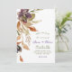 This wedding invitation has a pretty watercolor autumn succulent and foliage design along the left side. Colours used include olive green, plum, rust and orange. In the centre is calligraphy text in plum that features the bride and groom's names. The invitation details are in olive green and are customisable. Everything is displayed on a crisp white background. The back of the invitation has a purple watercolor wash background that coordinates with the rustic colours on the front. A great way to invite guests to your wedding.