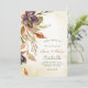 This wedding invitation has a pretty watercolor autumn succulent and foliage design along the left side. Colours used include olive green, plum, rust and orange. In the centre is calligraphy text in rust that features the bride and groom's names. The invitation details are in olive green and are customisable. Everything is displayed on a tan watercolor wash, neutral background. The back of the invitation has a creamy tan watercolor wash background that coordinates with the rustic colours on the front. A great way to invite guests to your wedding.