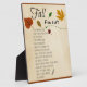 This seasonal custom Display Plaque features a 'Fall Fun List' of Autumn activities. The custom design lists 15 fun-filled fall favourites that are sure to make your bucket list. Fall leaves in various shapes, colours and sizes complete the design. And it's beautifully done in the warm earth-tone colours of Autumn. It comes with an attached easel stand, has an easy wipe-clean surface, and is available in 3 sizes. The Display Plaque is a great addition to your seasonal home decor, office, classroom, or a unique gift idea for fall birthdays! Feel free to browse our complete 'Fall Fun List' collection for coordinating products. Special design requests are accepted. Design by Glenda Motsavage, a Florida-based travel writer and author.
