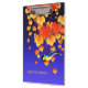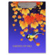 Fall scene: wild grape vines with orange, red, gold leaves and purple grape berries. A great tit sitting on a branch. Custom name, trendy hand-written font. Blue, bright yellow, black. Bold autumn colours, beautiful and vivid. Artwork based off of a vintage Japanese fine art print. Great for Thanksgiving but also anytime.