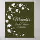 Pretty and modern bridal shower sign design features a spray of white flowers and white customisable text on Autumn green background. Mount or frame for a beautiful tabletop display.