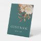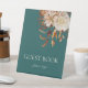 Fall Guest Book Pedestal Sign. Make your favour display even more inviting with this charming tabletop wedding sign. Featuring elegant fall watercolor florals and foliage—burnt orange and terracotta leaves, creamy beige dahlias, and copper roses—on a deep teal backdrop, it blends function and beauty perfectly. The compact format makes it easy to incorporate into your table styling. Add your personal touch and complete your favour setup with style.
