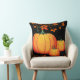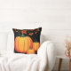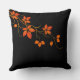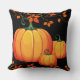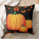 This throw pillow is shown in a autumn fall leaves and pumpkins print with a black background colour.