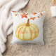 This throw pillow is shown in a autumn fall leaves and pumpkin print with a white background colour.