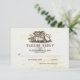 Vintage wedding RSVP card featuring fall harvest: barrel, fall vegetables and fruits, rural tools...