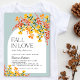 A perfect baby shower invitation for an autumn event. The design showcases a large grouping of beautiful fall coloured flowers and is accented with a white boho arched box and a light dusty teal background.