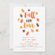 An autumnal typographic invitation to friends and family to meet your new addition. This design features the phrase "fall in love" in modern hand lettered style brush script font, falling illustrated leaves, and "Sip 'n' See" in modern font. The invitation can be fully personalised with your event details and features fall colours of orange, brown, mustard yellow/ochre. The reverse is in solid grey.